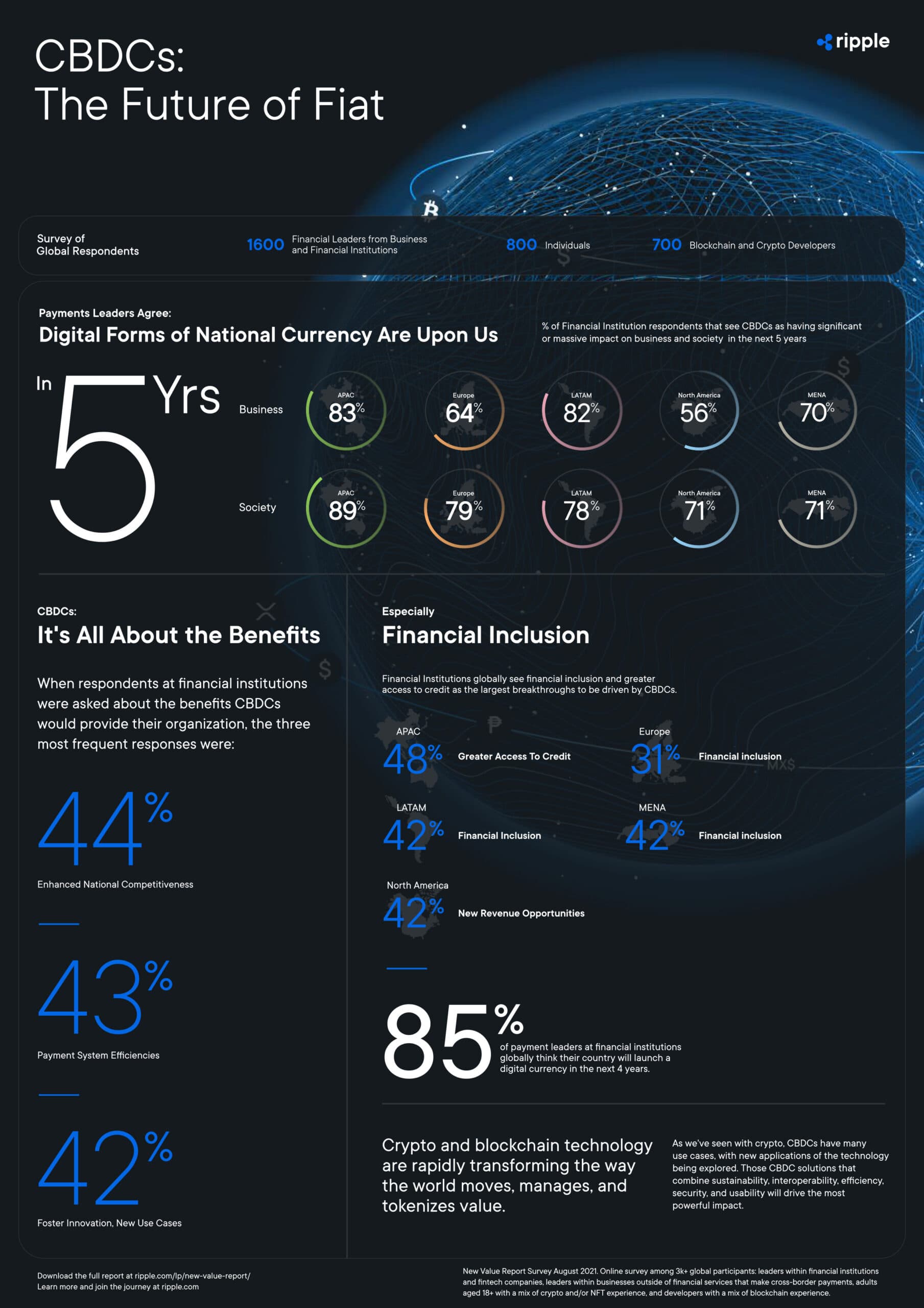 This tracks with another key survey finding highlighted in the infographic. Eighty-five percent (85%) of leaders at financial institutions think their country will launch a digital currency within the next four years. And beyond financial inclusion, many of them feel this technology would deliver enhanced national competitiveness (44%), greater efficiencies within their payment systems (43%) and advance innovation more broadly (42%).