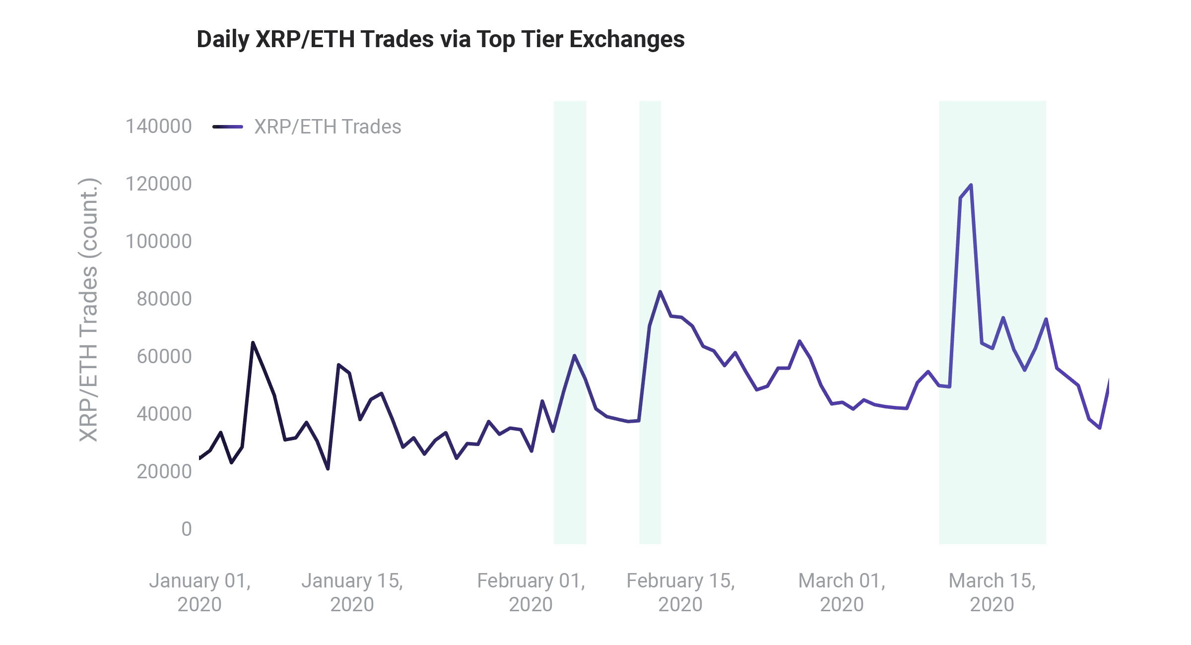 Figure 4. Top tier exchanges are ranked by CryptoCompare.com to reflect accurate market activities. During highlighted days, XRP/ETH trades increased significantly.