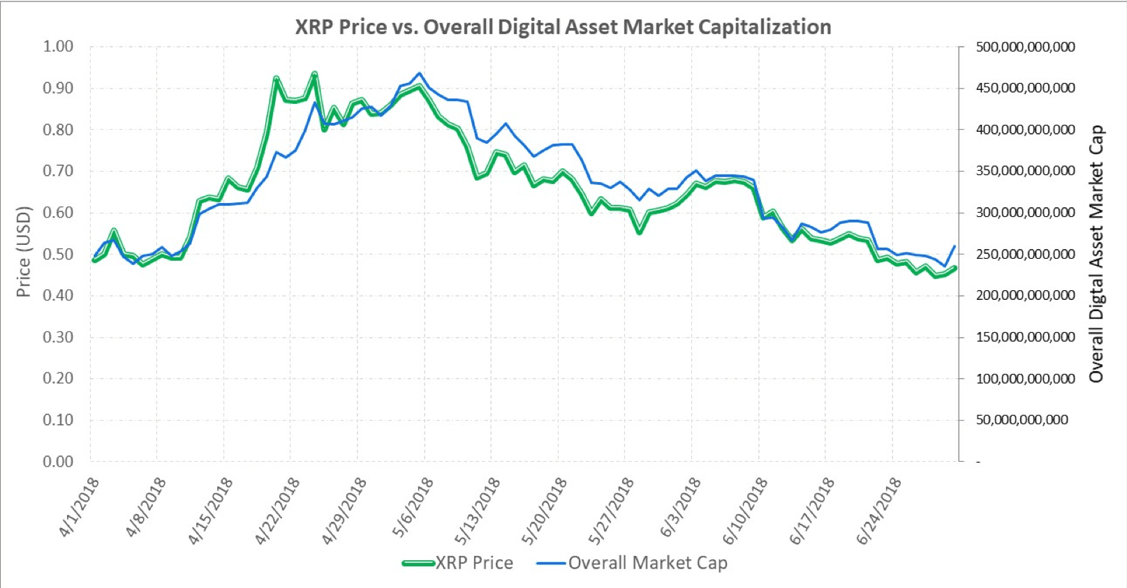 XRP’s overall market capitalization mirrored that of the overall digital asset market, though at times it was somewhat exaggerated in comparison. XRP began the quarter at $1.91 and finished the quarter at $0.51, a 73 percent drop from January 1. On March 31, 2018, XRP was up exactly 100 percent from the rally that began December 11. Broadly, Q1 market participants did not differentiate between different digital assets. While the Q4 rally was more sequential in nature, with interest in one asset waning as it increased in another, the Q1 retracement was indiscriminate, with the market collectively exiting positions. In fact, on February 25, XRP’s minimum 30-day correlation to the other top nine digital assets was 76 percent.