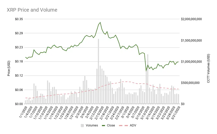 CCTT’s reported daily volume for XRP increased in Q1 2020 from Q4 2019. The average daily volume reported at $322.66 million in Q1 versus $187.34 million in Q4, and above Q3’s reported $198.10 average daily volume.