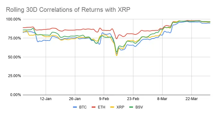 After showing signs of decoupling from large cap digital assets, correlations of XRP with other large capitalization digital assets spiked towards 100% following Black Thursday’s Market Meltdown.