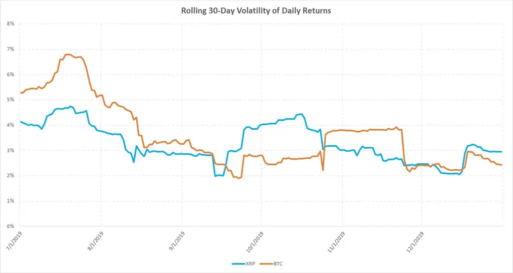 Based on CCTT’s closing price of XRP, XRP’s volatility of daily returns over Q4 was 3.1%, a drop in volatility from Q3’s 3.6%. XRP’s volatility over the quarter was similar to that of BTC (3.0%), and that of ETH (3.1%).