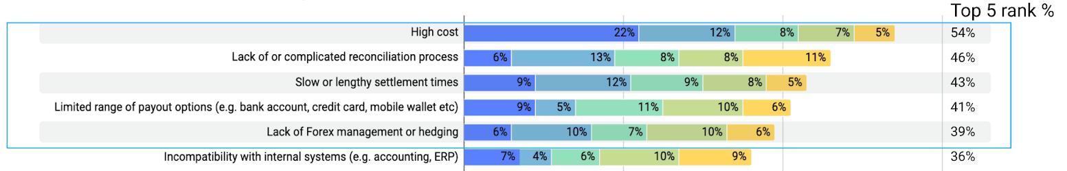 The survey findings uncovered that nearly half of respondents said that complicated reconciliation challenges are among their top five pain points, right after high costs. Several of these key pain points include: