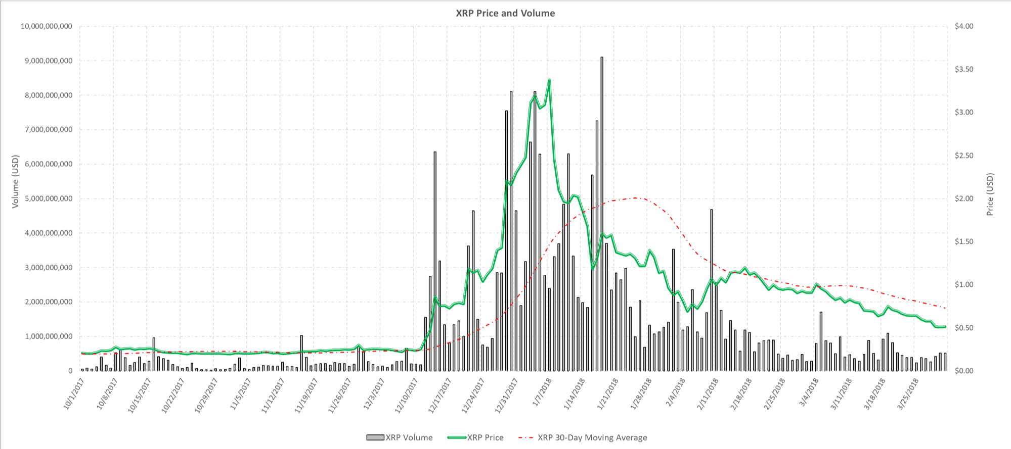 Quarterly Sales In Q1 2018, market participants purchased $16.6 million directly from XRP II, LLC — our registered and licensed money service business (MSB). XRP II, LLC is licensed to engage in Virtual Currency Business Activity by the New York State Department of Financial Services. Additionally, the company sold $151.1 million worth of XRP programmatically, as a small percentage of overall exchange volume. These sales represented 0.095 percent (9.5 basis points) of the $160.0 billion traded globally in XRP in Q1. Significantly larger volumes of XRP were traded in Q1, particularly during the first half of the quarter, resulting in a notional increase in programmatic sales by Ripple. Escrow In Q1 2018, XRP was released out of a cryptographically-secured escrow account. Three billion XRP was released out of escrow (one billion in January, February and March). However, 2.7 billion XRP was put back into new escrow contracts — 900 million in months 56, 57 and 58. The remaining 300 million XRP are being used in a variety of ways to help invest in the XRP ecosystem. Market Commentary: A Volatile Quarter, but XRP Market Share Increases