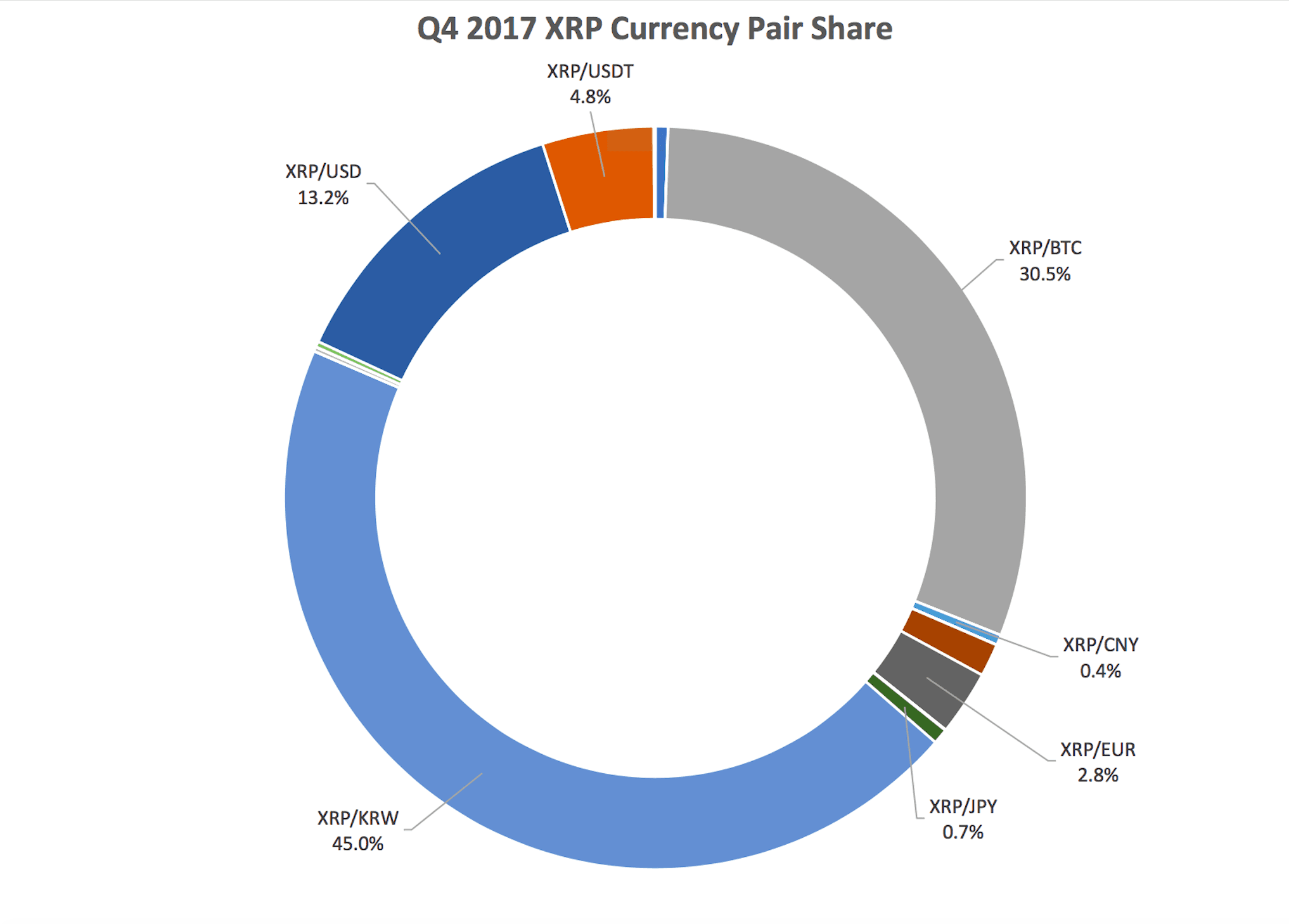 Though Korean markets continued to be a significant driver of XRP activity during the quarter, growing geographic diversification of XRP liquidity lowered KRW market share to 44.8 percent of total Q4 volume.